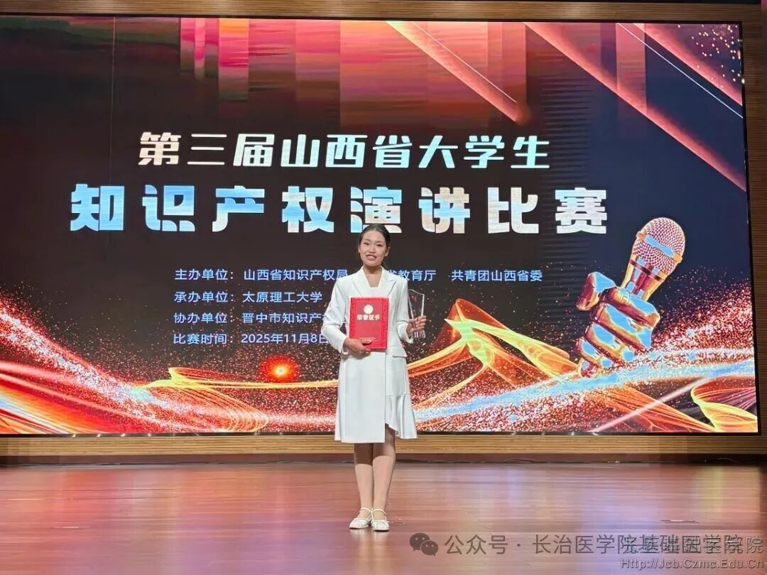 2025年11月8日,由山西省知识产权局、山西省教育厅、共青团山西省委共同举办的第三届山西省大学生知识产权演讲比赛在晋中市圆满落幕。此次比赛汇聚了全省各高校的优秀选手,竞争激烈。基础医学院医学实验技术专业2301班杨惠君同学代表长治医学院参赛,她凭借出色的表现脱颖而出,荣获三等奖,为学校争得了荣誉,充分展现了长医学子的卓越综合素养。