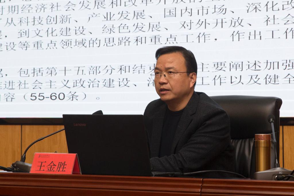 王金胜以视频《世界怎么变》开篇,与在座教职员工一起回顾了中国发展的蓬勃力量、“十三五”期间我国发展取得的决定性成就;报告围绕党的十九届五中全会审议通过的规划《建议》总体框架,从我国发展环境面临的深刻复杂变化、我国发展的目标任务和指导方针、加快我国未来发展的战略举措三个方面展开,对“新发展理念”“新发展格局”“新发展阶段任务”作了系统详细的阐述,对“十四五”规划和二〇三五远景目标作了全面剖析。