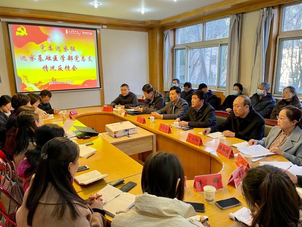 2021年11月9日下午,在基础医学部会议室召开校党委巡察组巡察基础医学部党总支情况反馈会,参加会议的有党委常委、纪委书记、监察专员、巡察领导小组副组长徐建和,副院长李长江,党委常委、组织部部长、党委巡察工作领导小组成员李永红,党委巡察工作领导小组成员、巡察办主任郭红娟,第二轮巡察第一巡察组全体成员,基础医学部党政领导班子成员,党支部书记,基础医学部各科室主任、分工会主席、分团委书记、专职组织员和辅导员。