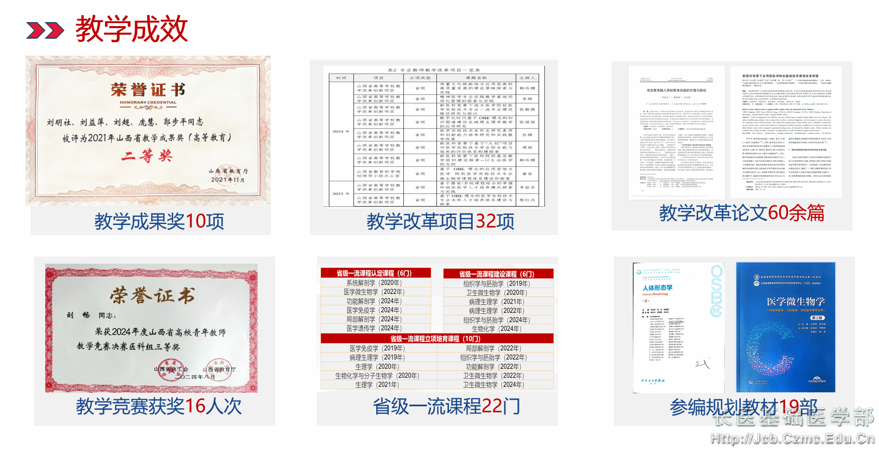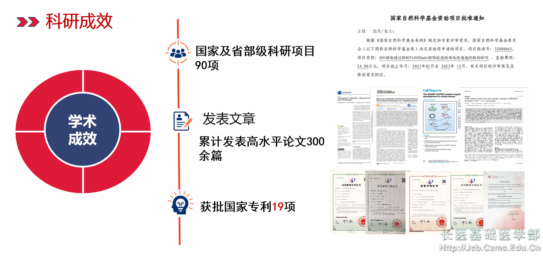 基础医学院现已形成消化系统疾病发病机制及干预研究、感染性疾病的基础和临床研究、神经精神系统疾病的基础研究及干预策略、衰老机制研究与转化应用等几个稳定的研究方向。近年来,承担国家级及省级以上项目90余项,发表高水平学术论文300余篇,其中SCI收录100余篇,部分发表在Cell Reports、Immunity、Oncogene上;山西省科技进步奖3项,授权专利30余项;获得省级以上教改成果奖10项,获得省级以上教改项目40余项;主编、参编各级各类规划教材120余部;指导学生参加各类竞赛,获奖100余项。