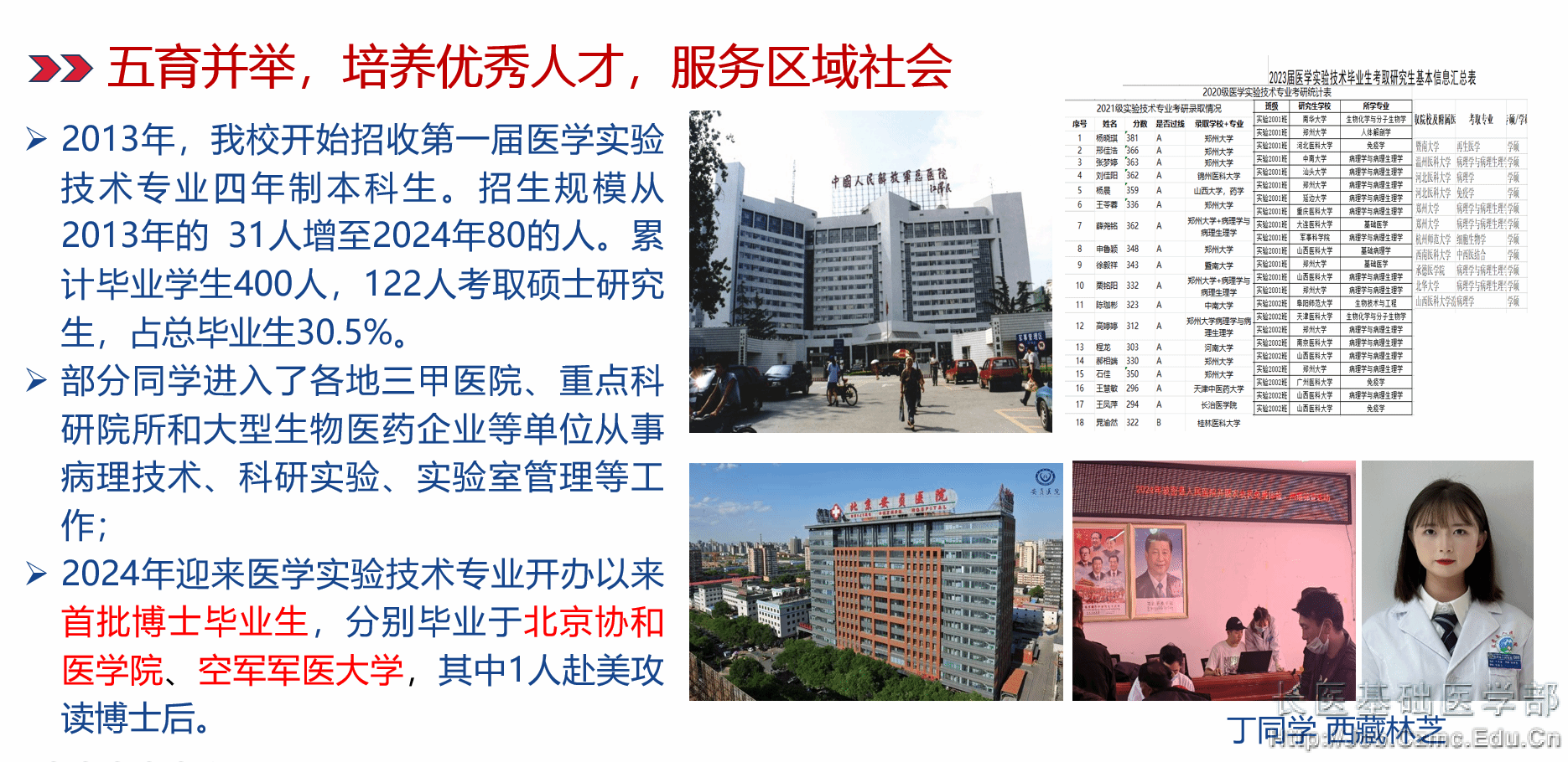 本专业学生考取的研究生分布在北京协和医学院、中山大学、中南大学、中国药科大学、暨南大学、安徽医科大学、天津医科大学、大连医科大学、郑州大学、山西大学、山西医科大学、昆明医科大学、内蒙古科技大学等院校,部分毕业生目前博士在读。在就业方面,本专业毕业生备受用人单位青睐,就业形势可喜,多数同学进入了各地各级医院、重点科研院所和大型生物医药企业等单位从事临床病理技术、科研实验、科研助理、实验室管理等工作。主要就业单位有:中国人民解放军总医院(301医院)、中国人民解放军第309医院、北京安贞医院、北京航天中心医院、广州中医药大学深圳医院、徐州医科大学附属医院、山西临汾市中心医院、山西同煤集团中心医院等医院病理科及科研实验室;北京协和医学院基础医学研究所、国家蛋白质组研究中心等科研机构;北京中关村生物公司、北京热景生物科技公司、金域检验中心、迪安检验有限公司、上海阿克曼医学检验所、山西尚宁高科技医学检验中心等知名生物科技企业。用人单位均反馈本专业学生基础扎实,动手能力强、能吃苦、有敬业精神、进入角色快。