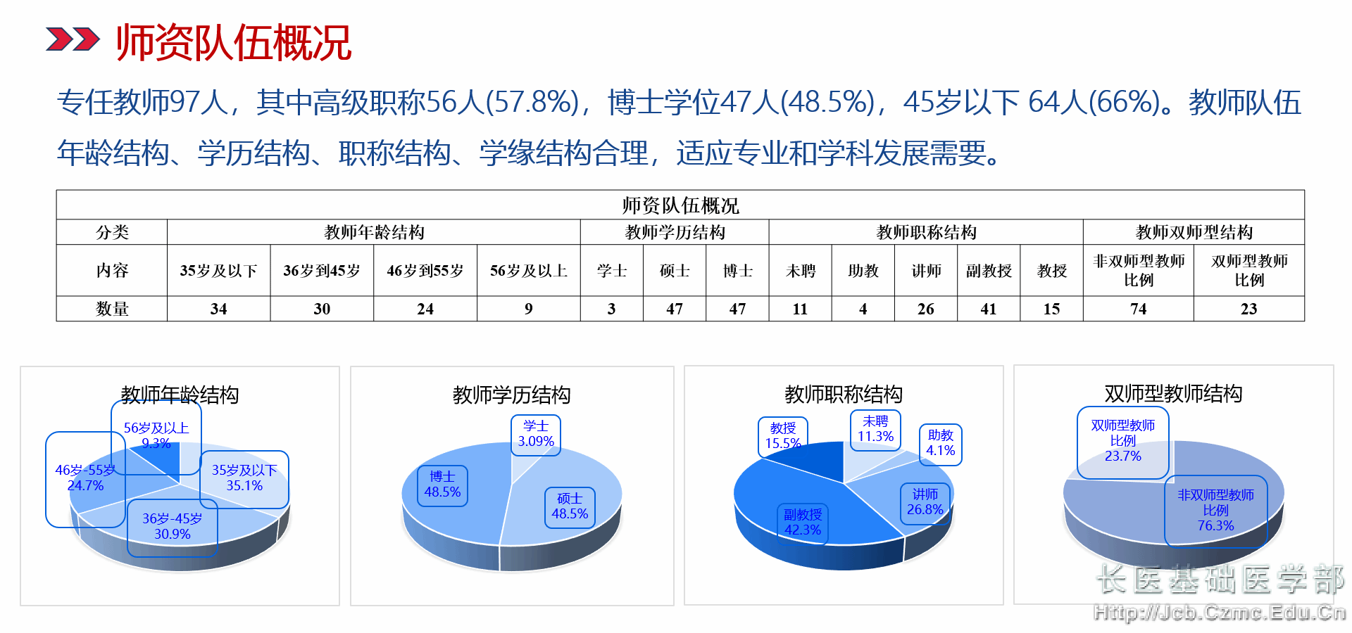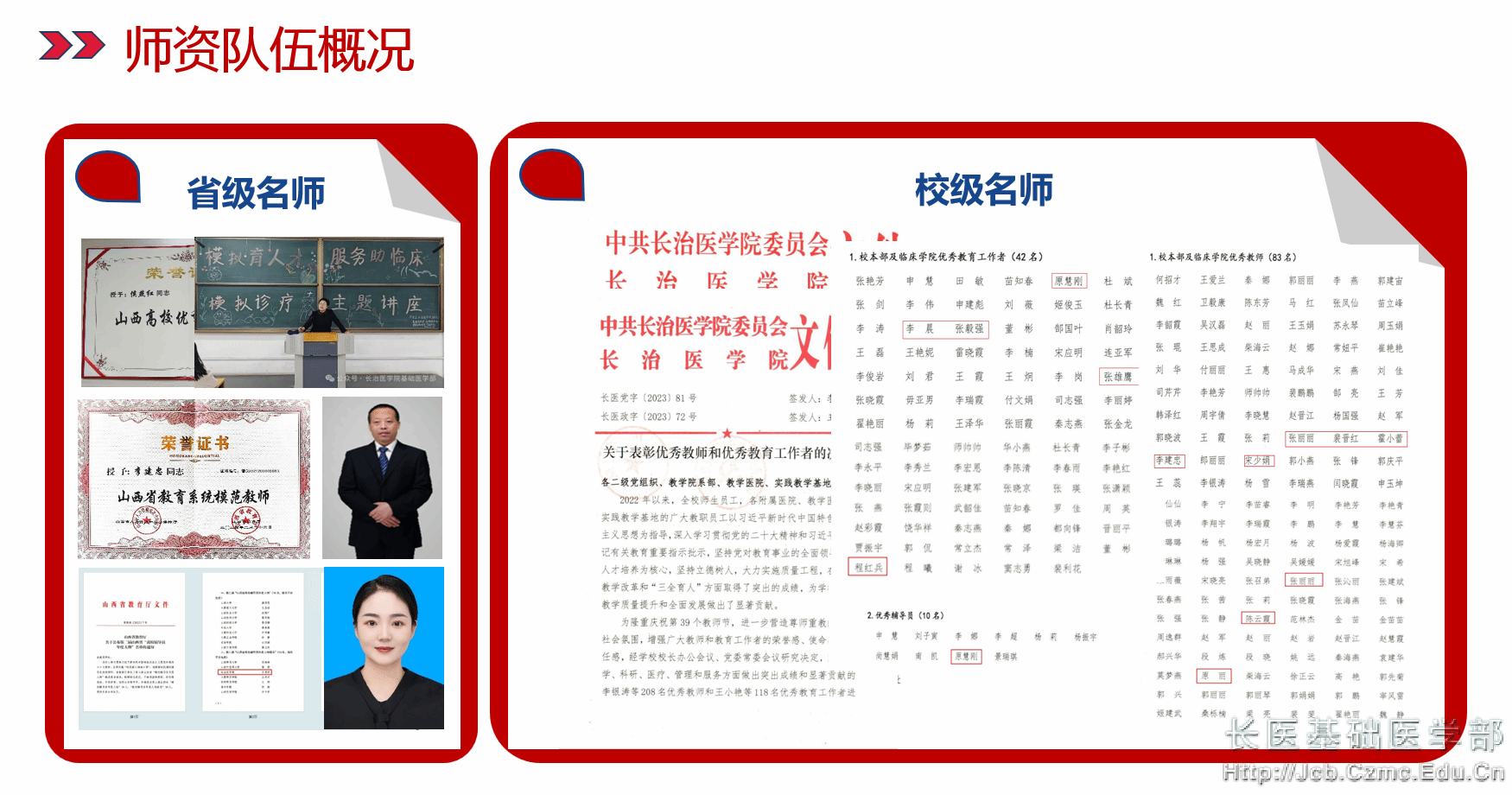 基础医学院发挥党组织核心作用,全面贯彻党的教育方针,落实立德树人根本任务,加强师德师风建设,拥有一支专业知识扎实、梯队结构合理、素质优良的师资队伍。现有教职工123人,其中专任教师97人,实验技术人员20人,行政管理人员13人(兼职7人);教授15人,副教授41人,高级实验师3人;博士47人,硕士61人(博士在读3人);硕士生导师47人。拥有山西省教学名师1名,山西省“三八红旗手”1名,山西省模范教师1名,山西省优秀共产党员1名,山西省优秀辅导员1名,国家级社会实践先进教师1名,山西省社会实践先进教师2名;校级教学名师1名,校级优秀教学团队1个;多名教师在山西省中青年教师教学基本功竞赛中分别获二、三等奖,其中4名教师荣立省级二等功;3名教师获山西课程思政教学二等奖。