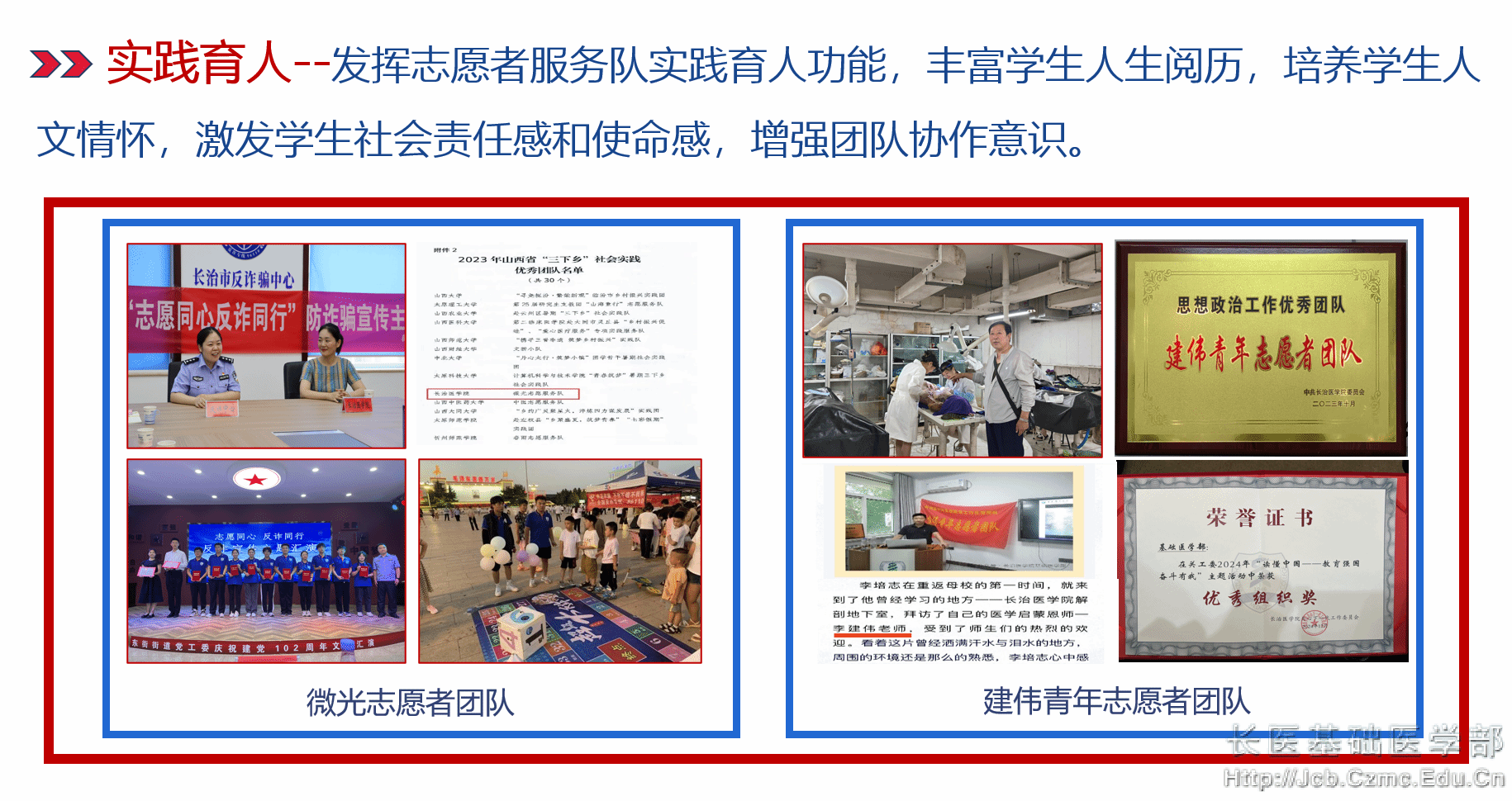 学生参加“全国大学生基础医学创新研究暨实验设计”大赛、“兴晋挑战杯”大学生课外学术科技作品大赛、“挑战杯”大学生创业计划竞赛、全国大学生电子商务“创新、创意及创业”挑战赛、“大学生职业规划大赛”等国家级、省级竞赛并获奖30余次。学生主持国家级大学生创新项目35项、省级76项、校级59项。薇光志愿服务队入选全国大中专学生“三下乡”社会实践之乡村振兴“笃行计划”专项行动全国示范性团队,连续两年被团中央表彰为优秀实践团队、山西省社会实践优秀团队,多名学生获得山西省先进个人表彰。